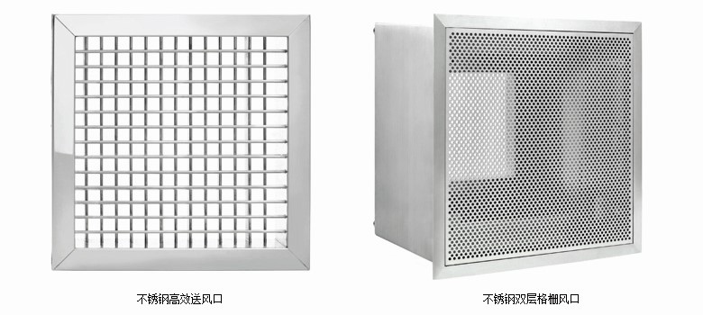 風口采用最新技術設計、使氣流分布更合理,箱體采用優質不銹鋼板或冷軋鋼板制作,表面經烤漆處理,結構簡單可靠,其中高效送風口可作為終端高效過濾單元直接置干各個級別的潔凈率吊頂等。